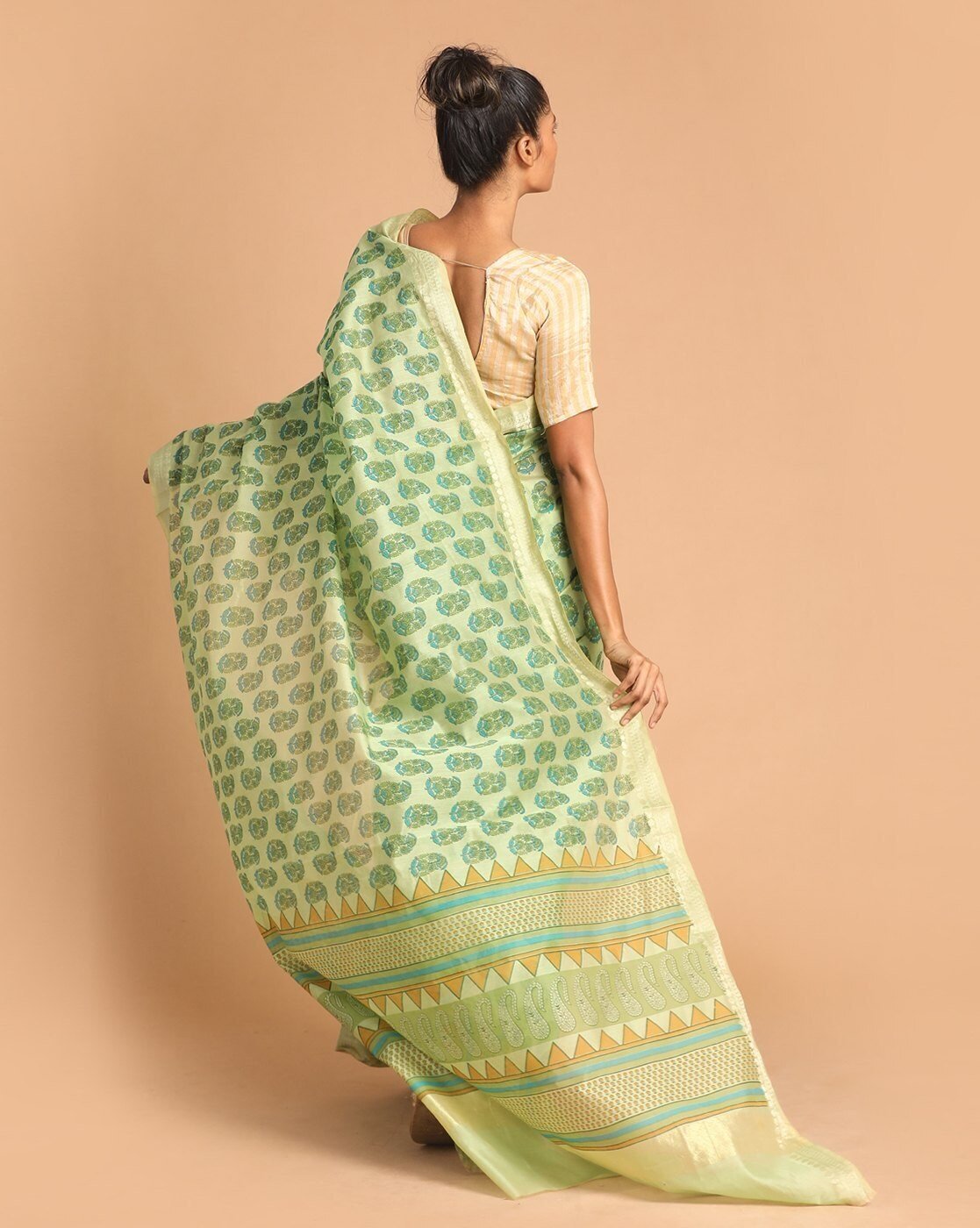 - The last image gives a detailed look of the blouse piece that comes with this saree (The model is wearing a blouse from our in-house wardrobe)