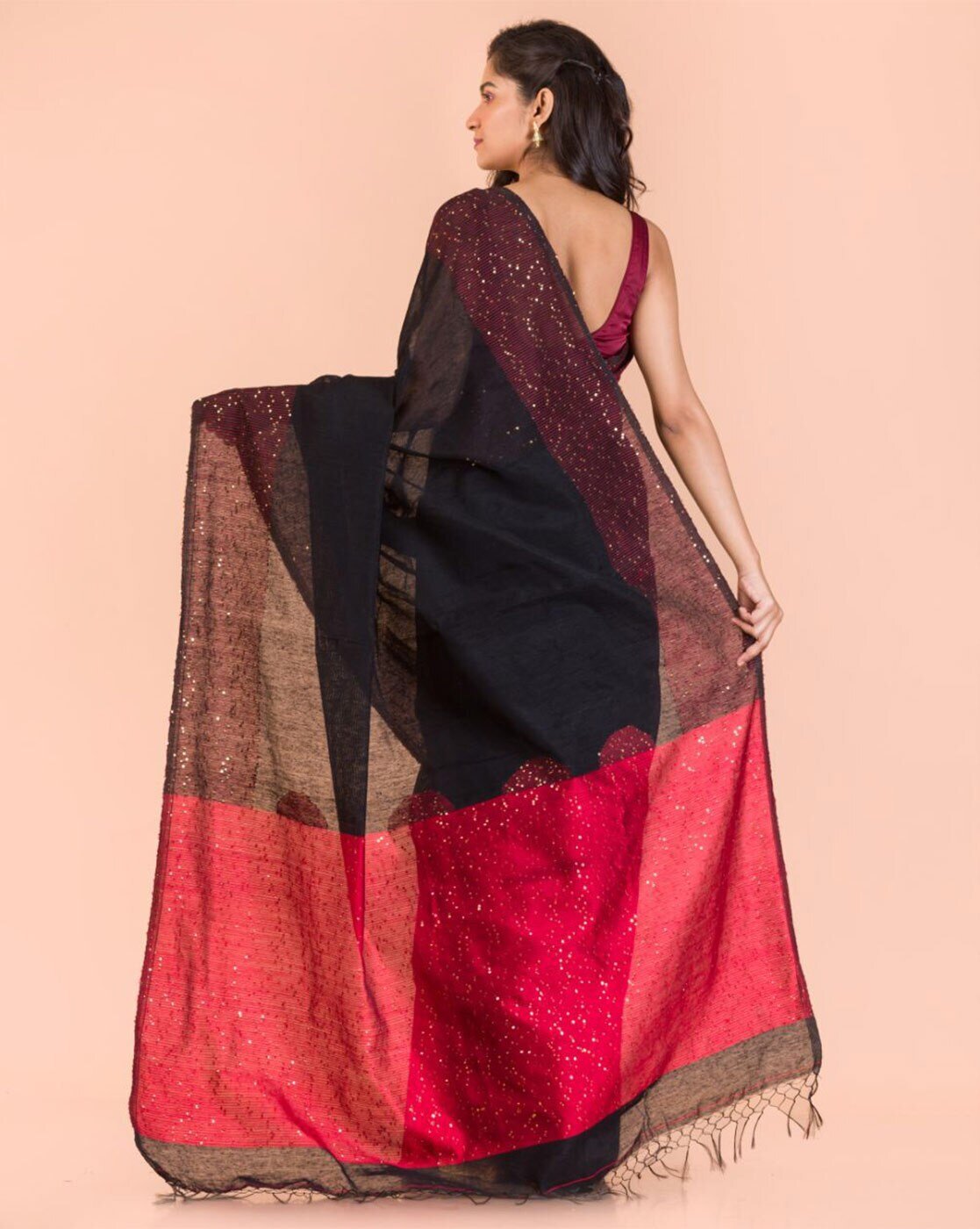 • The last image gives a detailed look of the blouse piece that comes with this saree (The model is wearing a blouse from our in-house wardrobe)