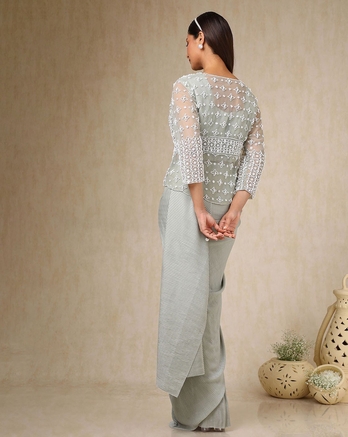 - The last image gives a detailed look of the blouse piece that comes with this saree (The model is wearing a blouse from our in-house wardrobe)